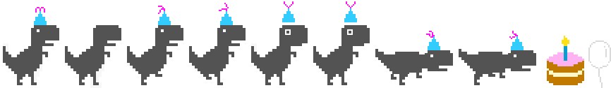 When the cake is eaten, the speed of the Lonely T-Rex increases. A party hat will appear on the T-Rex afterwards, and balloons appear as a replacement for the clouds once the score 100 is reached. If the Dino misses the birthday cake, another birthday cake will spawn until it is eaten.